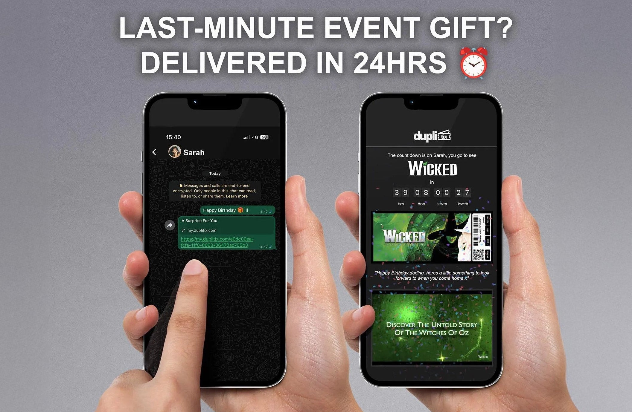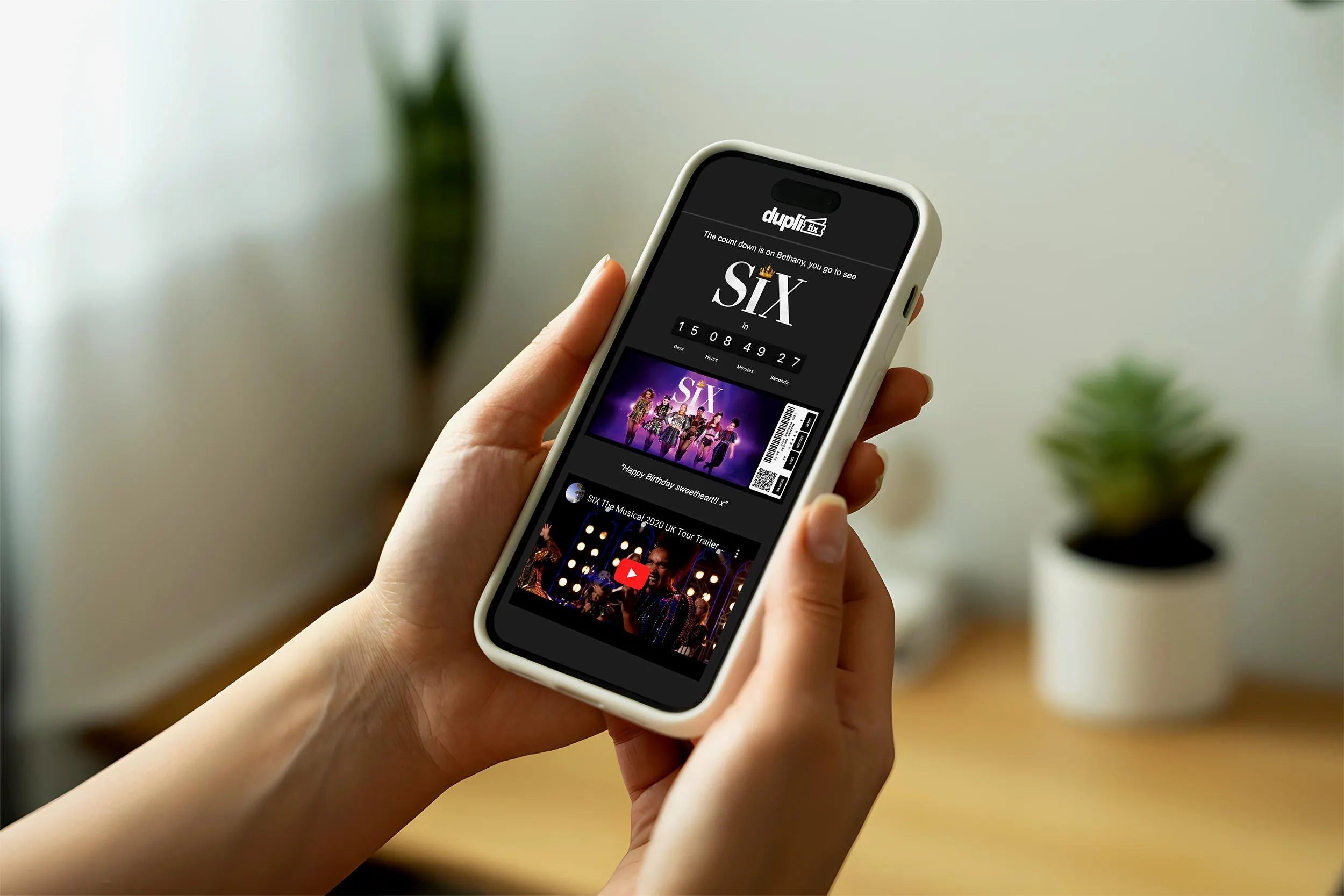 On every ticket there is a unique personalised QR code, by hovering over it with your IPhone or Android camera, a link will appear taking you to your own personalised webpage with an active countdown timer. On the day of the event the page bursts with confetti adding some additional excitement for your recipient.